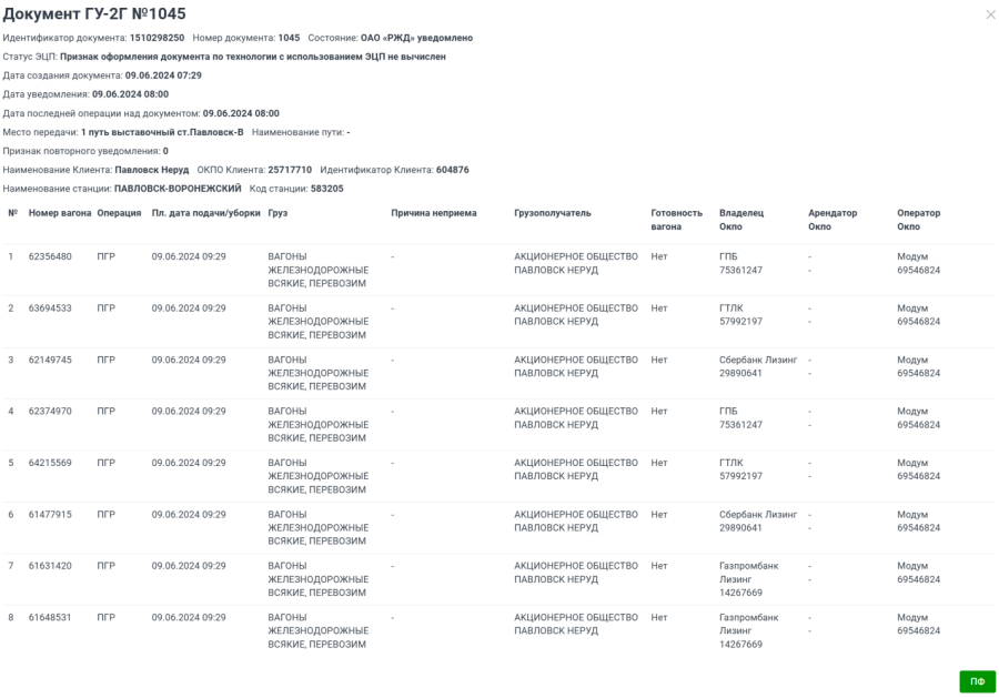 Не все документы доступны для скачивания из системы. Если документ отсутствует в Rail Cargo, то вместо скачивания при нажатии на кнопку будет осуществлено перемещение в ЭТРАН на страничку документа с возможностью скачать.